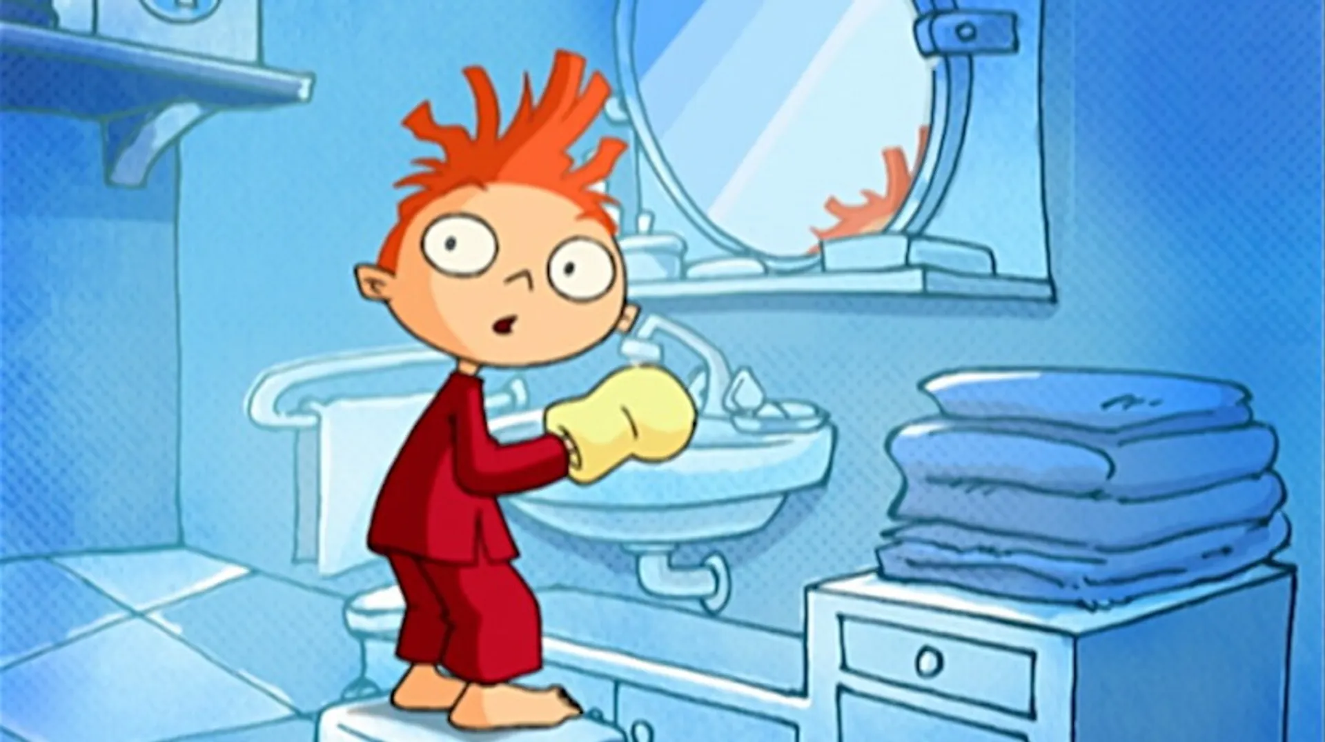 +"description": "Lucas trouve que se laver, c'est perdre son temps! Célestin, lui, se met sous la douche avec délectation."