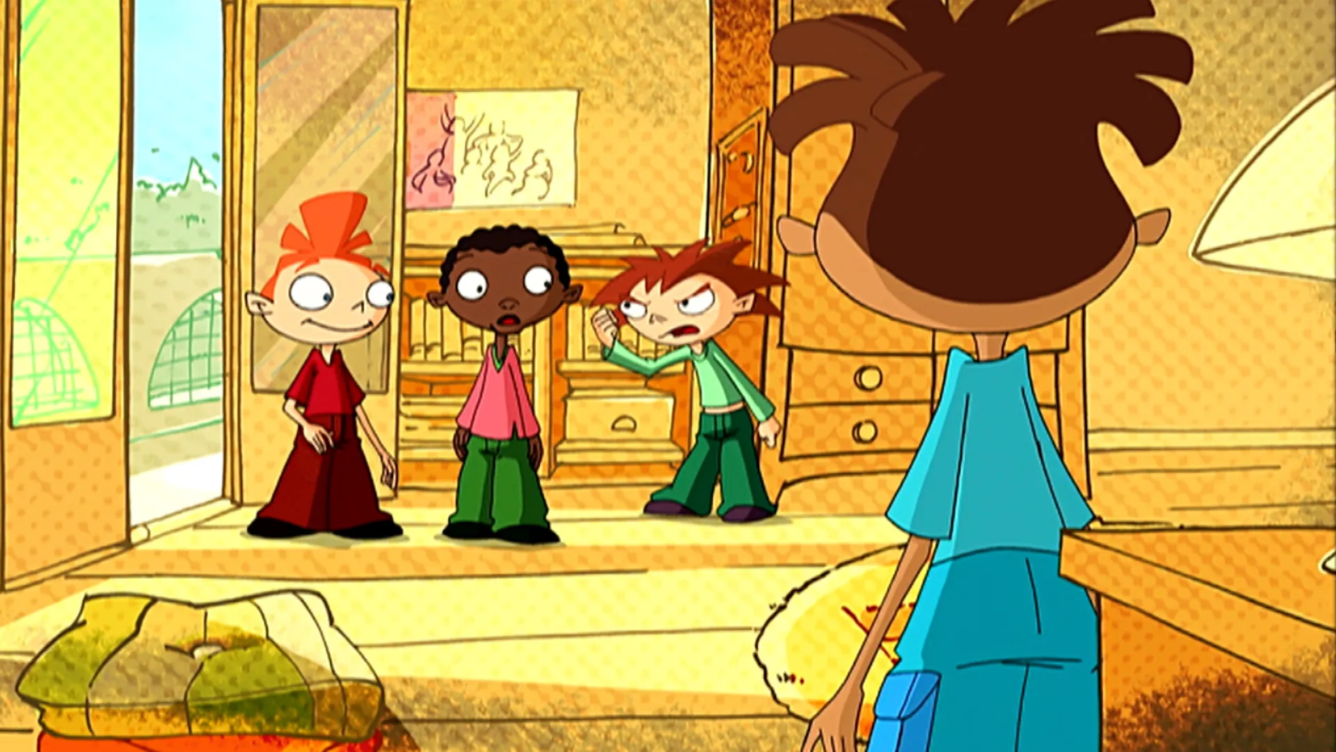 Victor a apporté le jeu de fléchettes de son grand frère chez Lucas. Quand, il revient, il ouvre la porte juste au moment où Victor lance une fléchette.