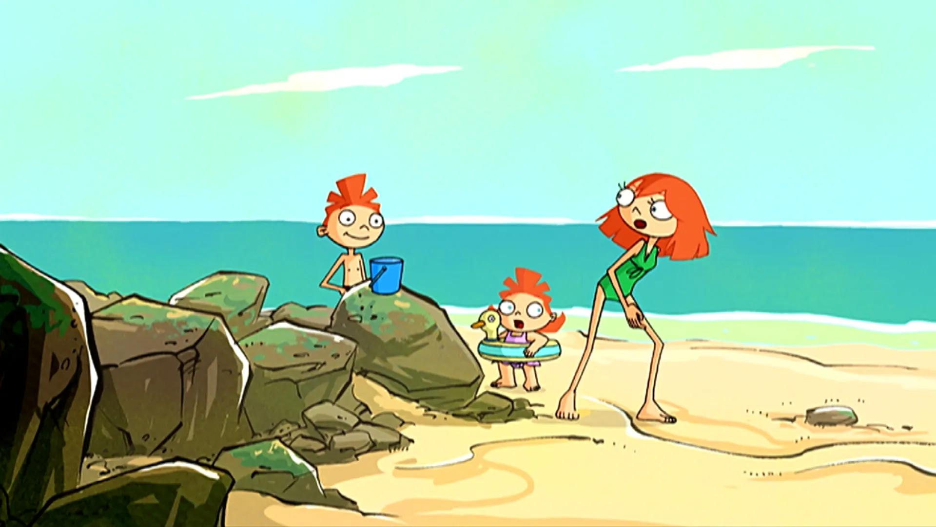 +"description": "Lucas emmène Lili barboter dans une petite piscine naturelle. Lili porte une bouée et elle a apporté avec elle son seau en plastique. "
