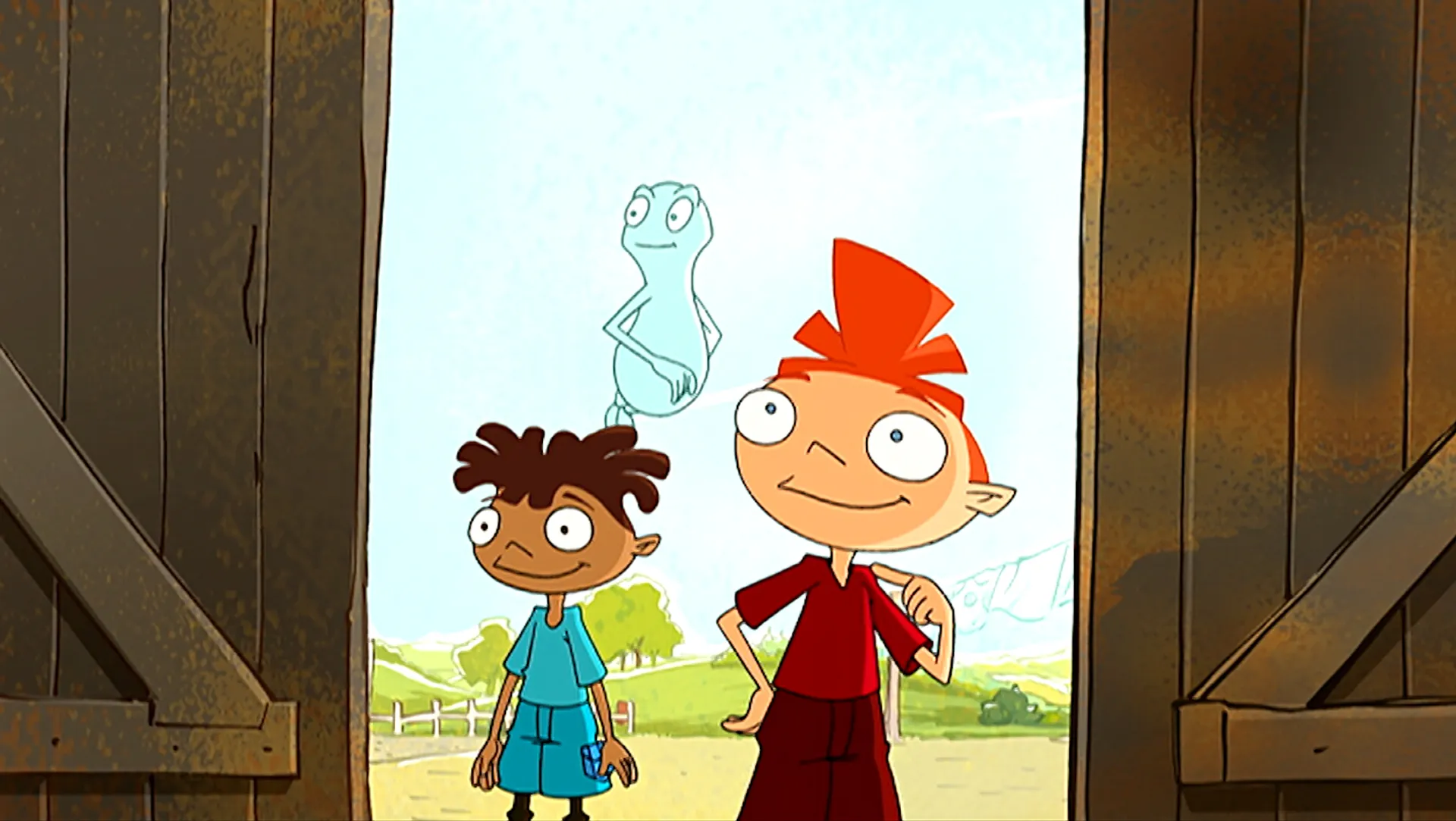 Dans une grange, Thomas et Lucas s'amusent à sauter dans des gros tas de foin. Thomas manque de se faire mal sur une fourche dissimulée dans le foin.