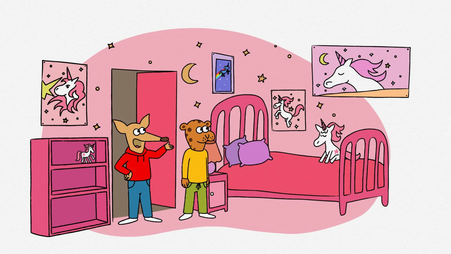 Wawa est très fier de présenter sa chambre à Baba, et avec elle, sa splendide collection de licornes.