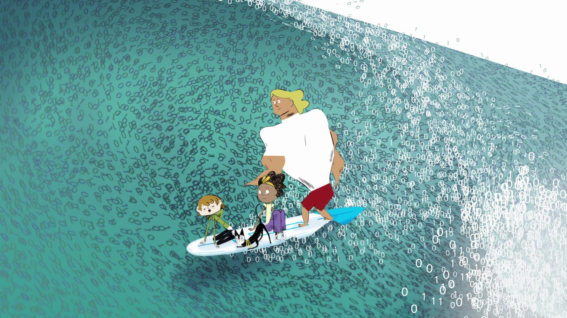 Mitzi, Noah et Le Chat se font emporter par une vague de 1 et de 0. Une véritable plongée dans le monde numérique !