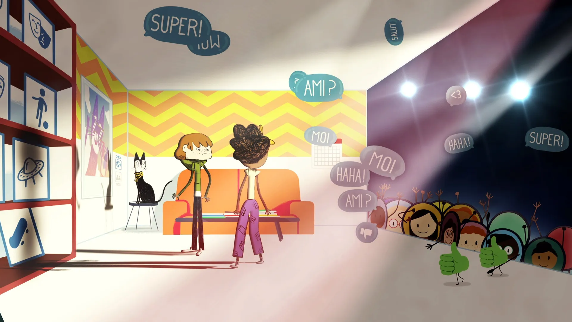 Comment ? En suivant leur chat derrière l'écran, pardi ! Et oui ! Devenu une star du Web, expert certifié es buzzomètre grâce à son succès sur les réseaux sociaux, Le Chat passe de l'autre côté de l'écran comme ça lui chante. Et il peut même y emmener les enfants. Miaou, non ? Alors youhouuu ! Les voilà carrément #DansLaToile, prêts à suivre leur guide.