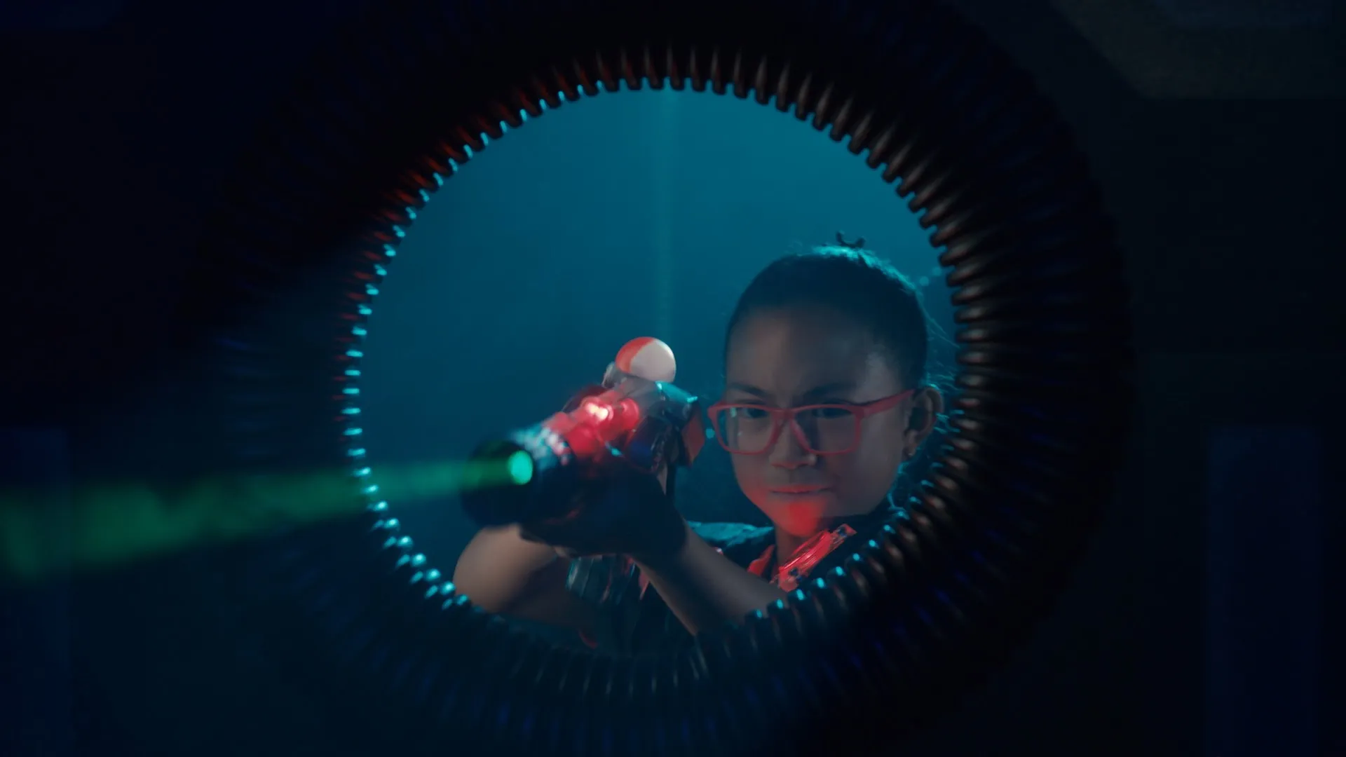 Dex, aidé de son père, combat sa mère et Kayla au pistolet laser tout en essayant de résoudre la dino expérience 1012 : « les Velociraptors chassent-ils seuls ou en groupe ? »