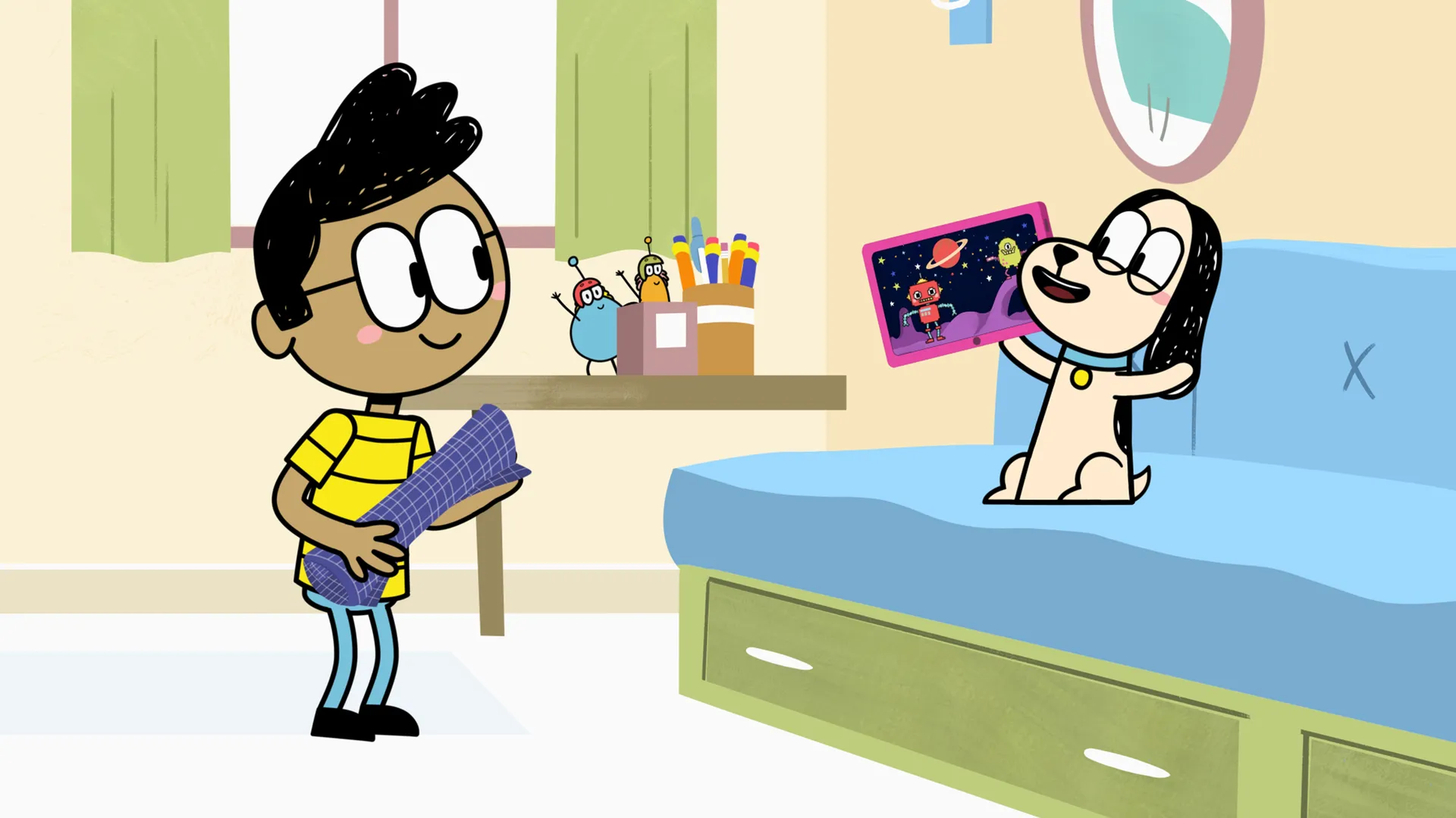+"description": "Théo veut qu'Abigaëlle l'aide à fabriquer une mangeoire à oiseaux, mais elle ne peut pas s'arrêter de regarder "Les Robots bip bip", c'est trop divertissant! "