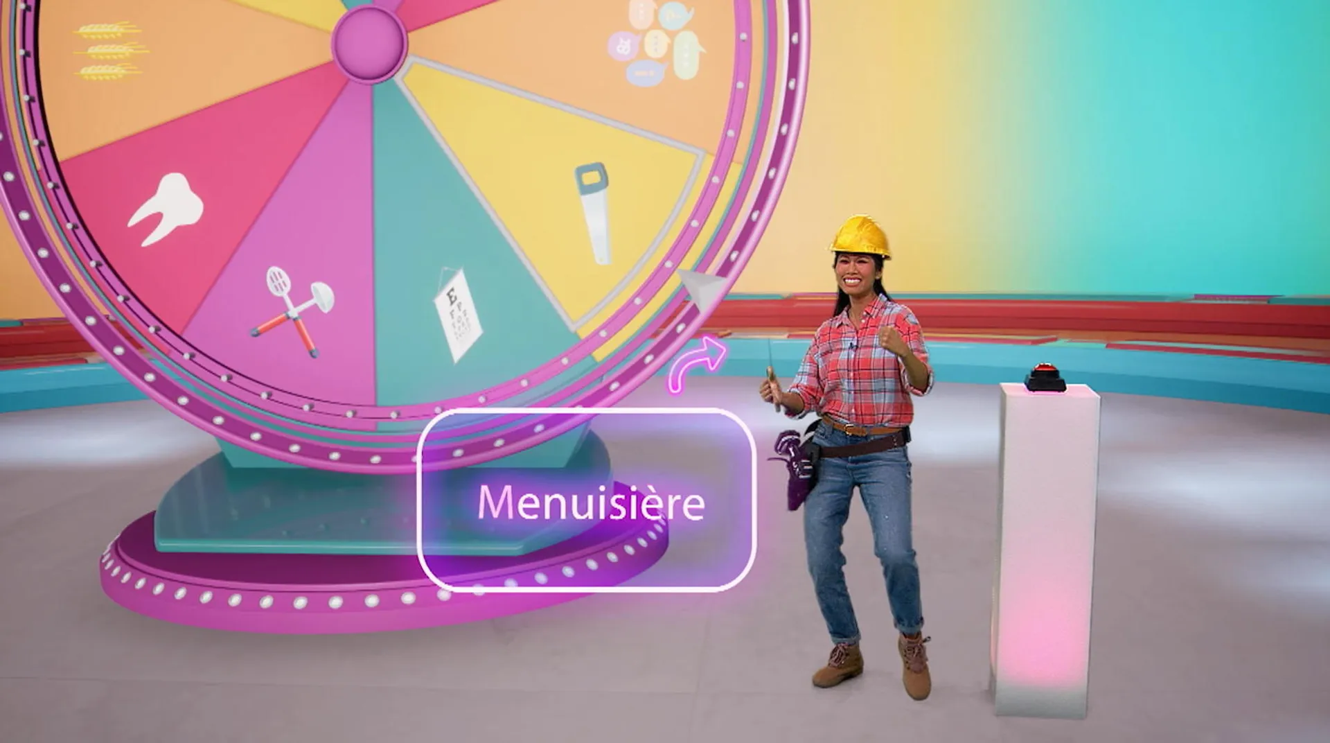+"longDescription": "La joueuse Alice tourne la roue du jeu et le métier du jour lui est dévoilé... menuisière! Waouh, elle découvre plein de choses sur ce métier passionnant : en quoi il consiste, quelle études il faut faire, etc."
