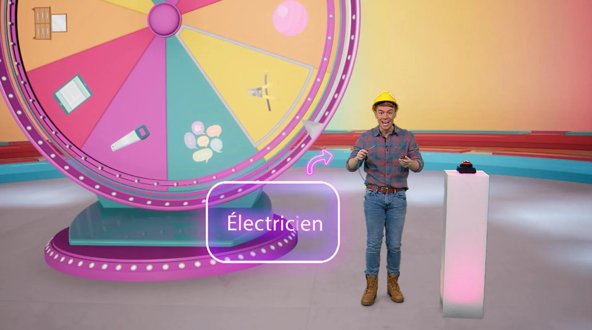 +"longDescription": "Le joueur Christopher tourne la roue du jeu et le métier du jour lui est dévoilé... électricien! Waouh, il découvre plein de choses sur ce métier passionnant : en quoi il consiste, quelle études il faut faire, etc."