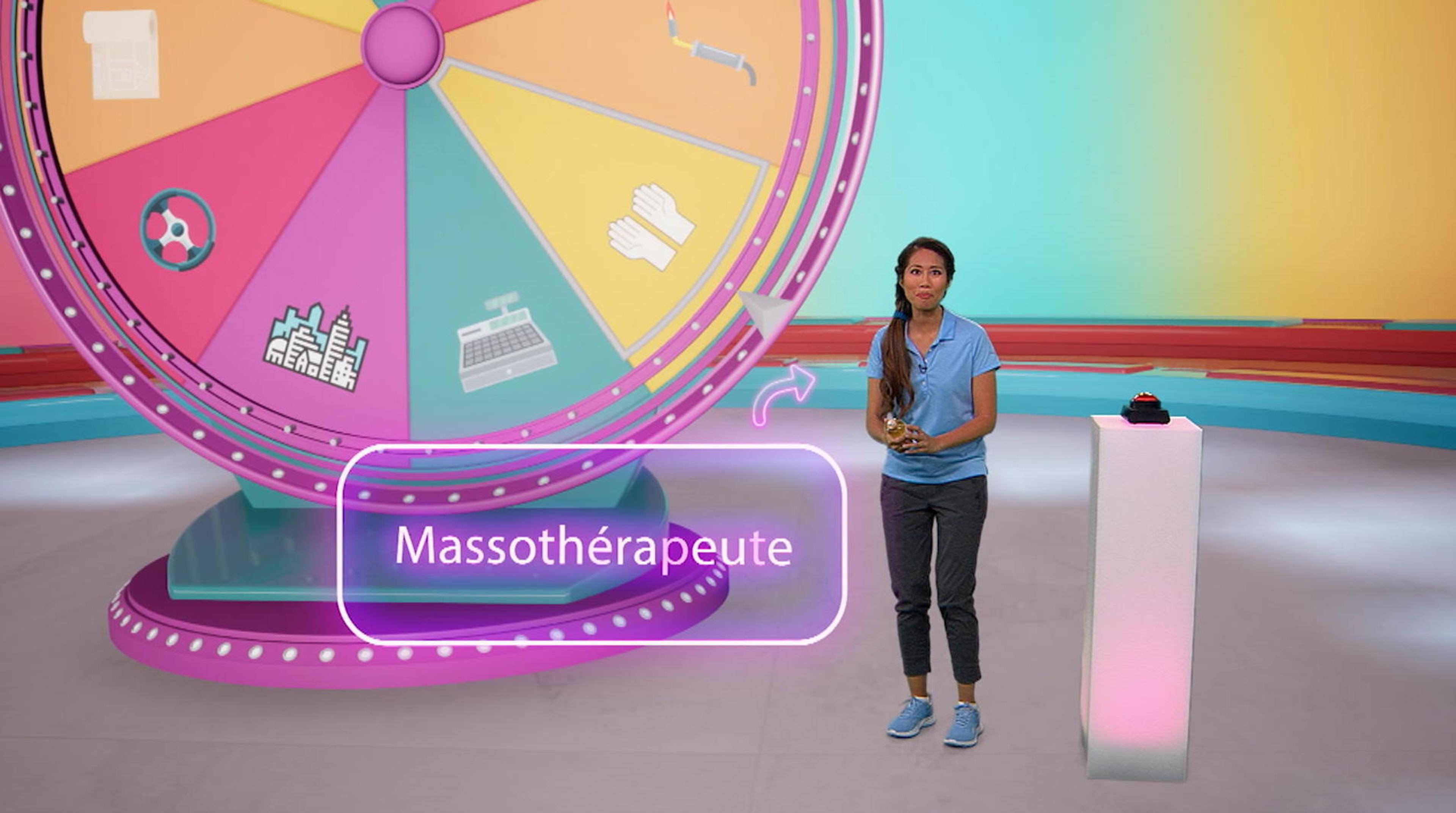 +"longDescription": "La joueuse Alice tourne la roue du jeu et le métier du jour lui est dévoilé... massothérapeuthe! Waouh, elle découvre plein de choses sur ce métier passionnant : en quoi il consiste, quelle études il faut faire, etc."