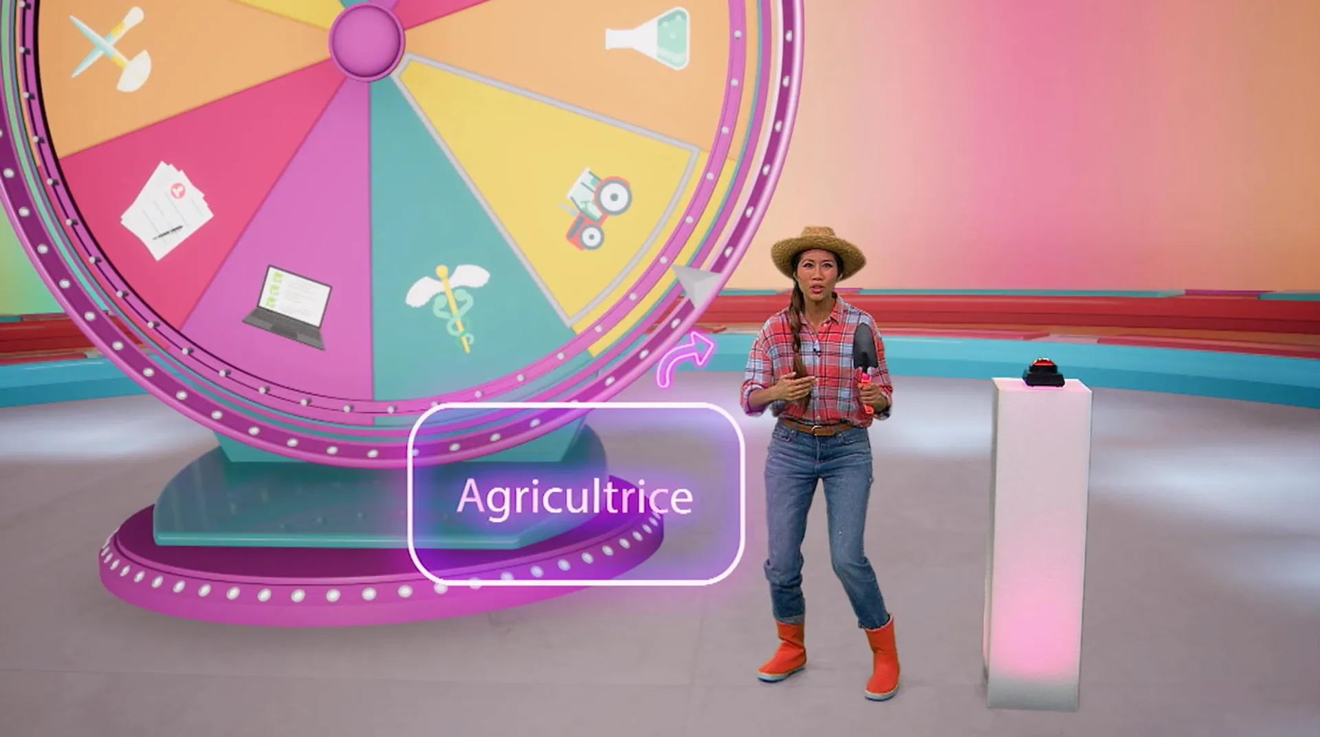 +"longDescription": "La joueuse Alice tourne la roue du jeu et le métier du jour lui est dévoilé... agricultrice! Waouh, elle découvre plein de choses sur ce métier passionnant : en quoi il consiste, quelle études il faut faire, etc."
