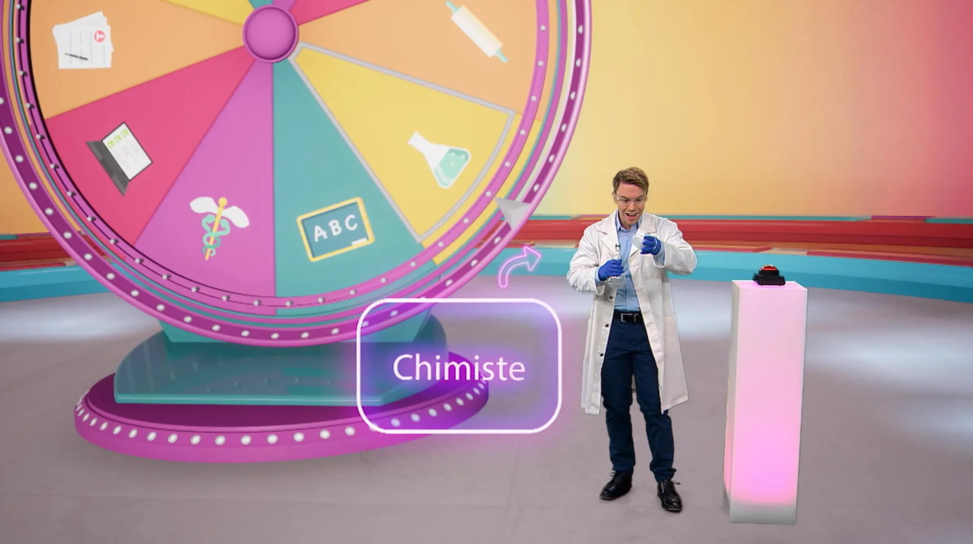 +"longDescription": "Le joueur Christopher tourne la roue du jeu et le métier du jour lui est dévoilé... chimiste! Waouh, il découvre plein de choses sur ce métier passionnant : en quoi il consiste, quelle études il faut faire, etc."