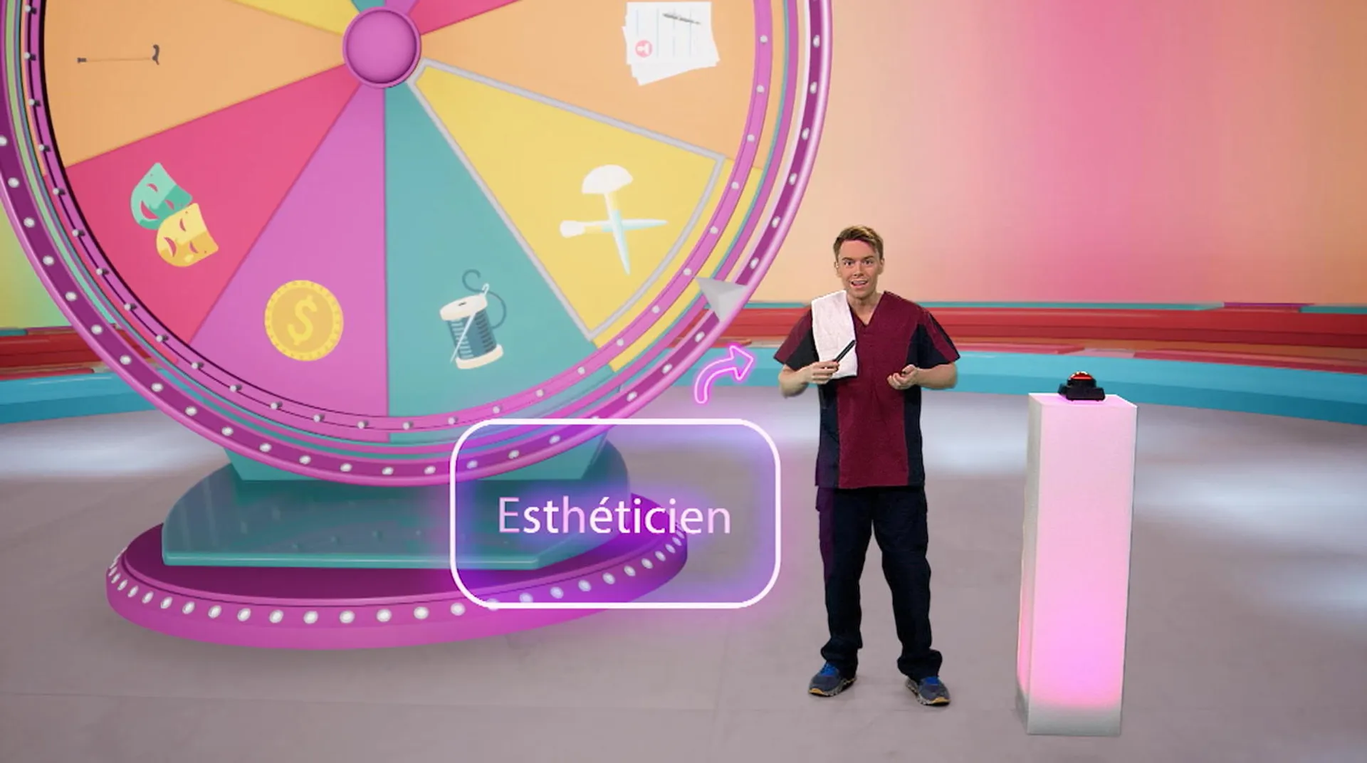 +"longDescription": "Le joueur Christopher tourne la roue du jeu et le métier du jour lui est dévoilé... esthéticien! Waouh, il découvre plein de choses sur ce métier passionnant : en quoi il consiste, quelle études il faut faire, etc."