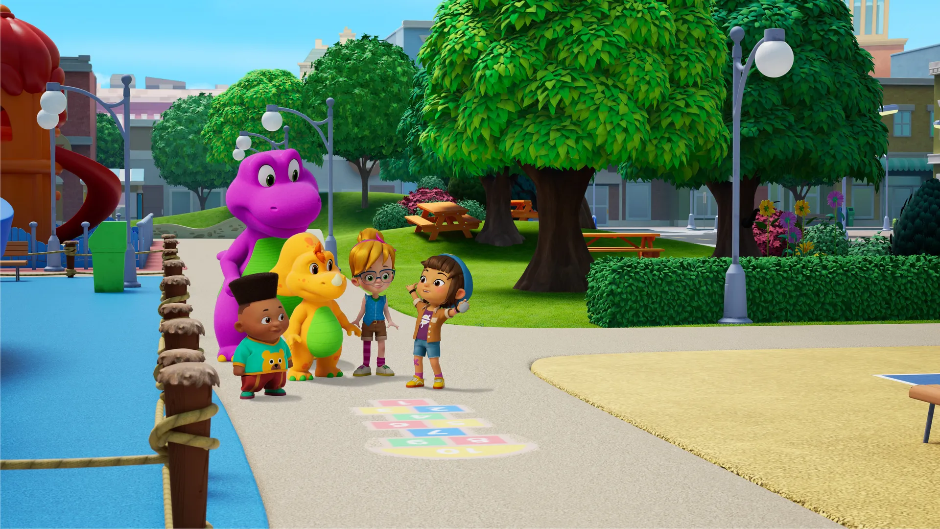 Voici Barney, le dinosaure violet qui chante, danse et répand de l'amour autour de lui ! Cette nouvelle série d'animation se déroule dans la plaine de jeux de la ville, où Barney s'amuse en compagnie des dinosaures Billy et Baby Bop, ainsi que de leurs trois jeunes amis. À travers leurs aventures créatives ou amusantes, Barney aide les enfants en bas âge à comprendre leurs émotions et leurs tracas. Il leur explique comment s'apprécier, comment aimer et traiter les autres avec respect.