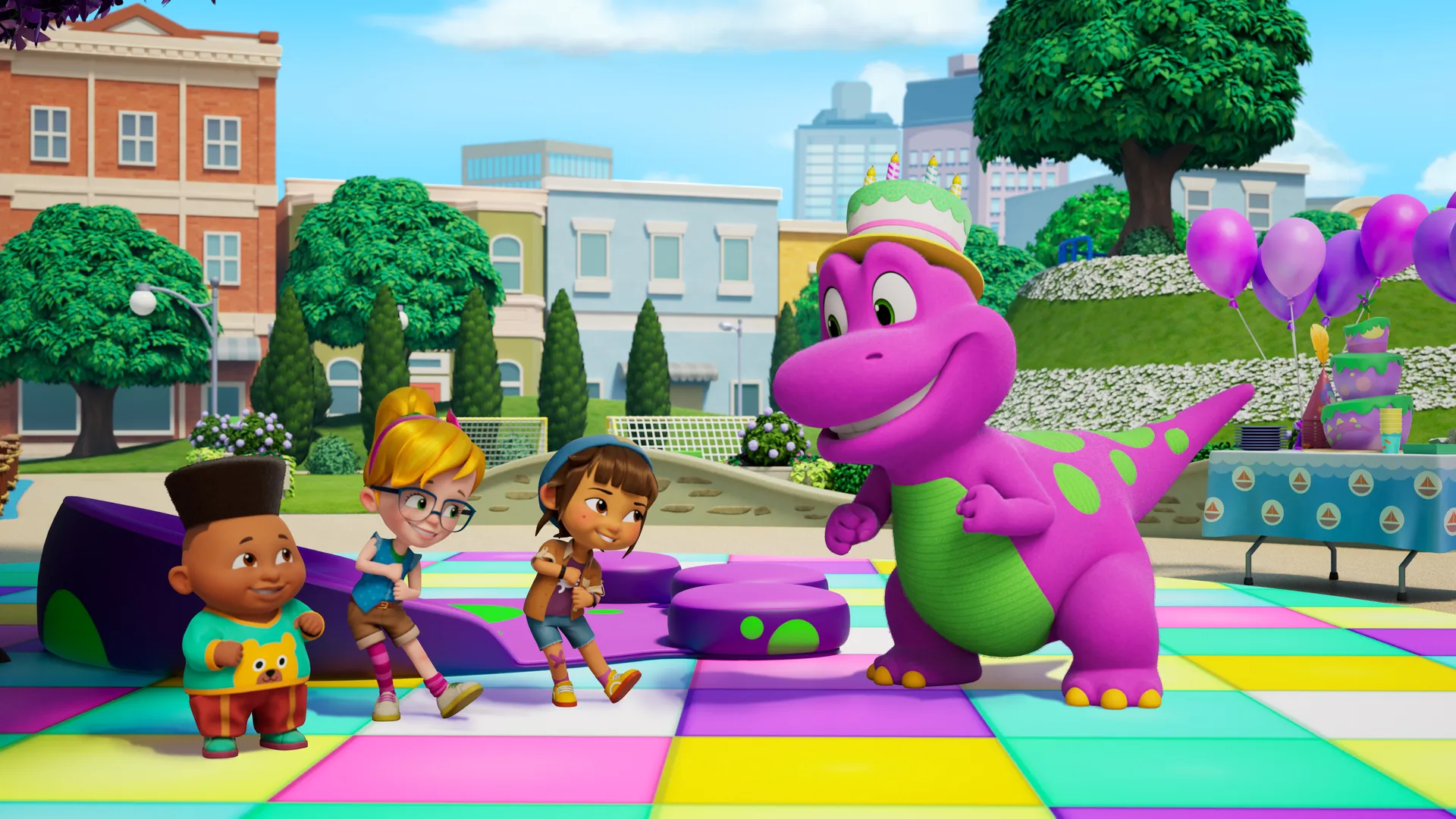 Voici Barney, le dinosaure violet qui chante, danse et répand de l'amour autour de lui ! Cette nouvelle série d'animation se déroule dans la plaine de jeux de la ville, où Barney s'amuse en compagnie des dinosaures Billy et Baby Bop, ainsi que de leurs trois jeunes amis. À travers leurs aventures créatives ou amusantes, Barney aide les enfants en bas âge à comprendre leurs émotions et leurs tracas. Il leur explique comment s'apprécier, comment aimer et traiter les autres avec respect.