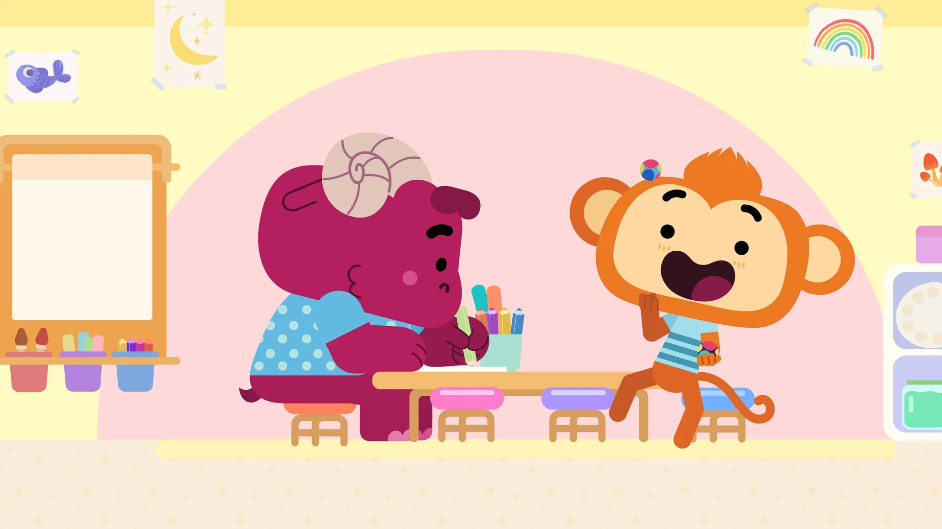 +"description": "Désirant leur parler, Zoumzoum ne cesse de déranger Zeveux et Beurk, qui sont occupé(e)s à dessiner ou mettre la table. "