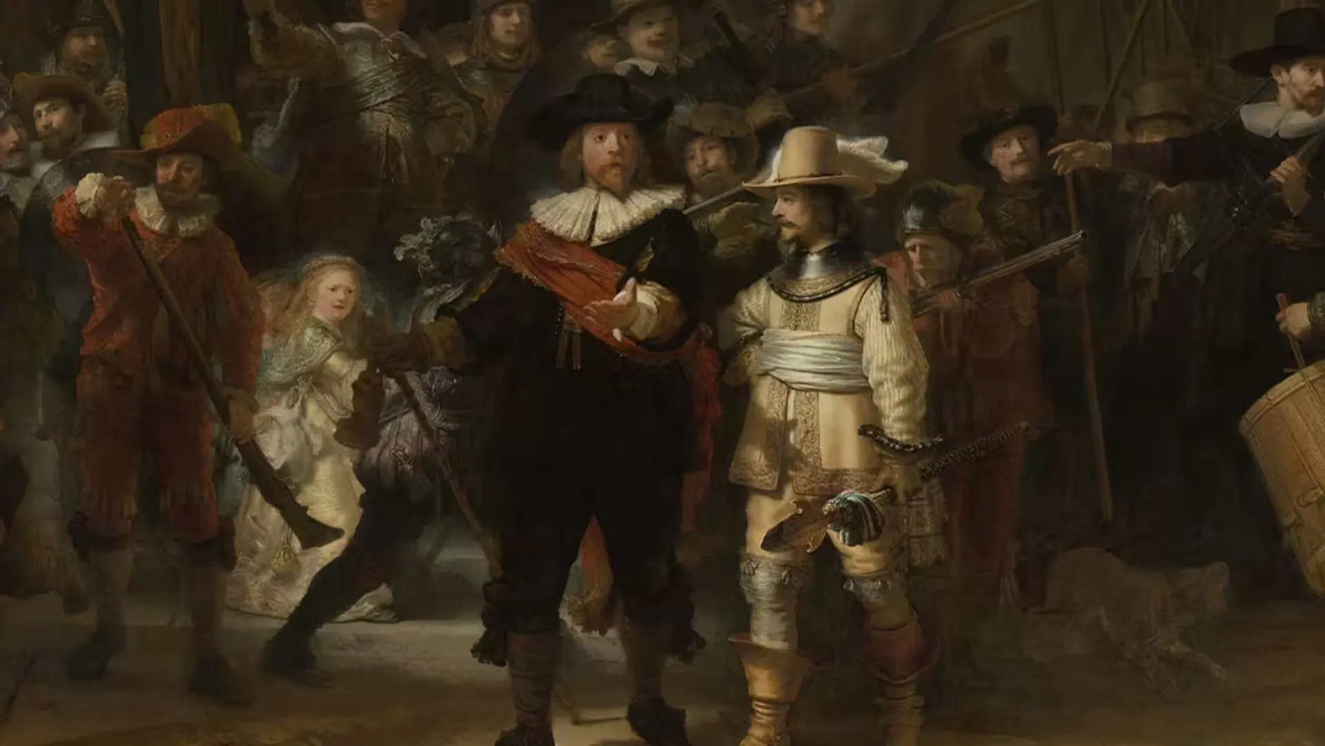 En peignant la ronde au sommet de sa gloire, Rembrandt transcende ses personnages et les normes. Il mêle les époques et les populations pour un hommage suprême à la liberté et la puissance d'Amsterdam.