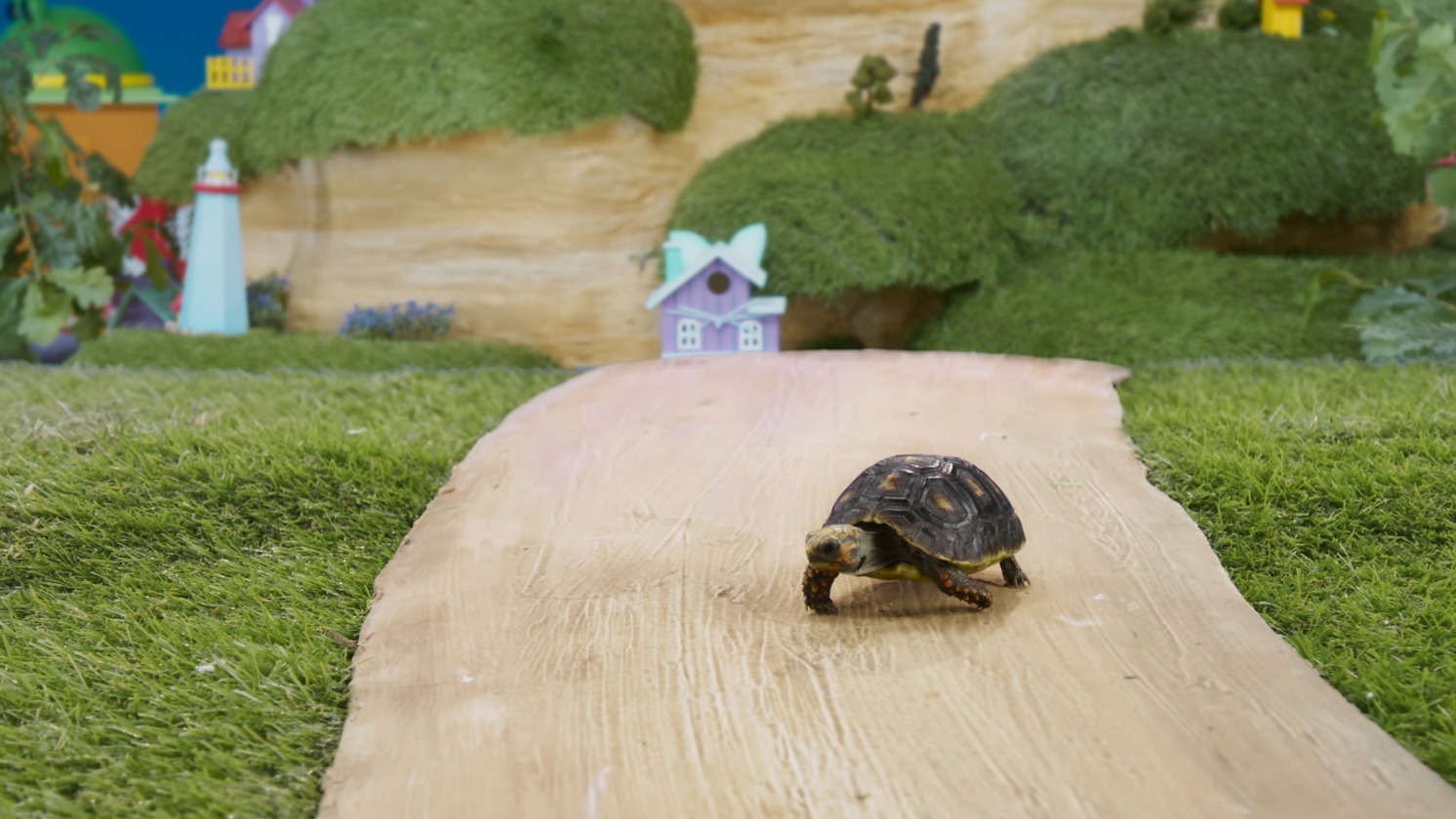 +"description": "Myrtille la tortue fait tout le chemin jusqu'à la maison de Patoune \rPendant que le petit chiot s'efforce d'être patient en attendant de jouer avec son amie."