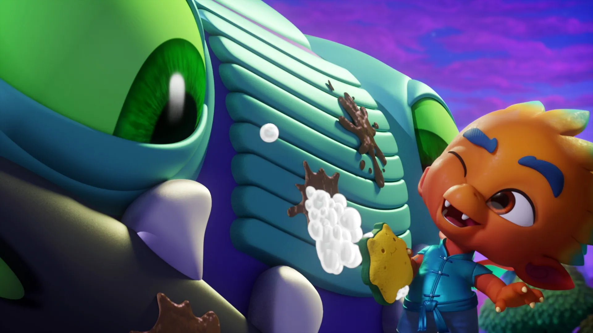 En jouant, Glorb et Henri laissent des traces de boue partout sur Gus le Bus. Les Super Mini Monstres décident de lui donner un bain et font une découverte incroyable.