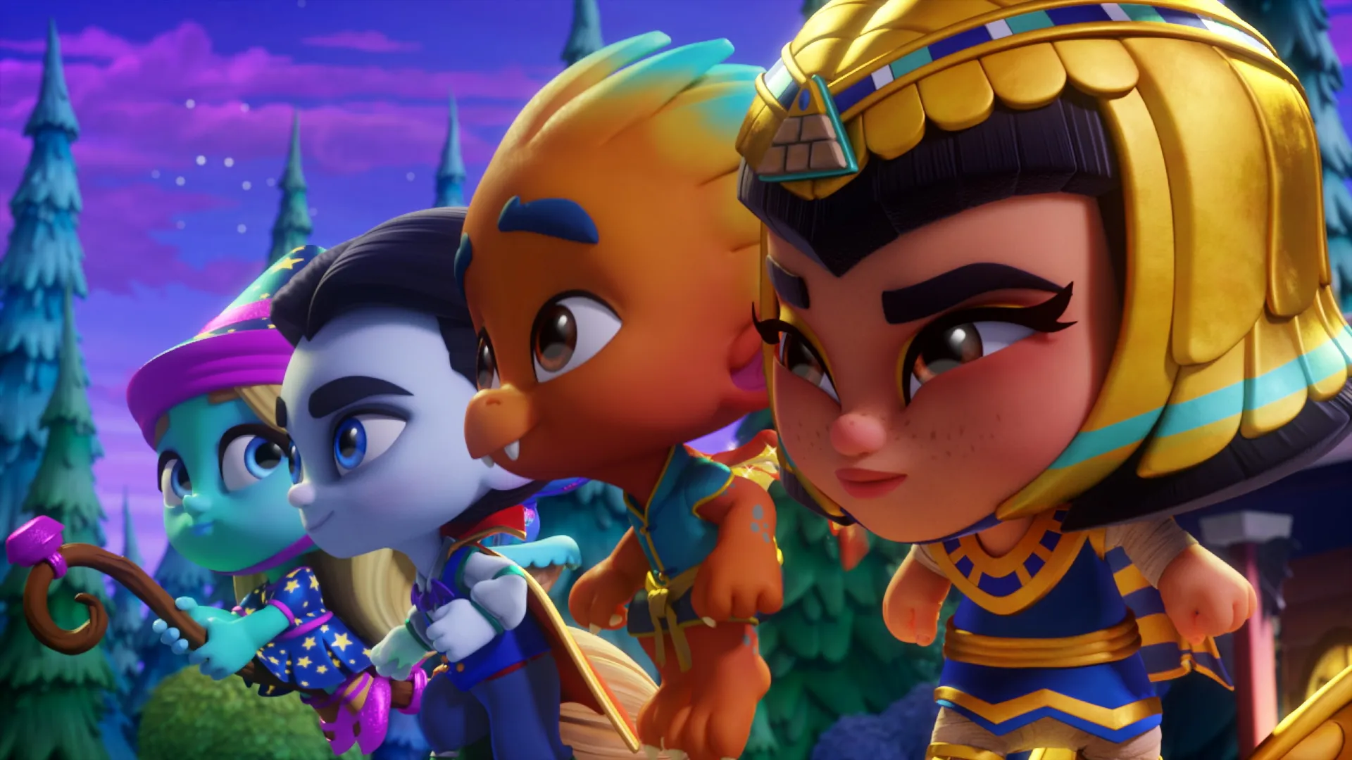 Bienvenue à la maternelle Pitchfork Pines. C'est ici que viennent les enfants des monstres les plus célèbres (et moins célèbres) du monde pour apprendre à être les meilleures personnes et les meilleurs monstres possibles. Drac, Cleo, Lobo, Katya, Zoe, Frankie, Spike et Vida sont des élèves de maternelle ayant une double identité : le jour, ils sont humains, et la nuit, ils se transforment en monstres. C'est pourquoi cette maternelle commence chaque jour à la tombée de la nuit, car lorsque le soleil se couche, ces petits élèves scintillent de magie et se réjouissent en se transformant en SUPER MINI MONSTRES ! "Quand le soleil se couche... Les monstres se réveillent !"