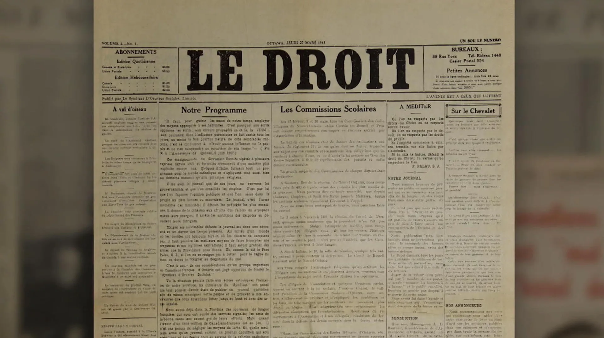 +longDescription : "En mars 1913, les Canadiens-français de l'Ontario, avec l'appui des Pères Oblats, lancent le journal Le Droit à Ottawa pour combattre la montée francophobe qui déferle sur l'Ontario. La combativité de la communauté est claire dans la devise qu'elle donne à son quotidien : « L'avenir est à ceux qui luttent ». De luttes en victoires, de ruptures en alliances, un siècle plus tard, le journal Le Droit est demeuré tant bien que mal, un acteur dans la quête de justice de cette communauté. Ce documentaire, réalisé dans le contexte du 100e anniversaire de sa fondation, fait revivre un siècle de l'histoire tumultueuse et indissociable des Canadiens-français de l'Ontario, devenus Franco-Ontariens, et de leur quotidien. "
